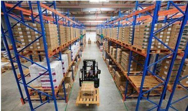 叉車滾筒式軌道搭配:叉車將貨物搬運至貨架高的一端,貨物利用自重滑下存儲。
