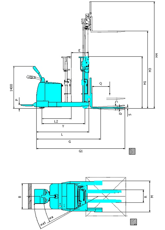 | Dimensions(尺寸) | Overall length of frame(mast no reach)(整車長度)(門架沒前移不含貨叉) | L | mm | 1500 | 1700 | 1800 |